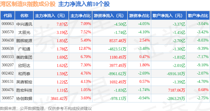 资金流向方面,湾区制造R(480009)指数成份股当日主力资金净流入合计6.83亿元,游资资金净流出合计8.29亿元,散户资金净流入合计1.45亿元。成份股资金流向详情见下表: