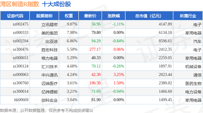 湾区制造R(480009)指数十大成份股详情如下: