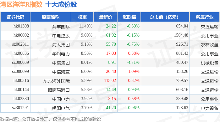 证券之星消息,11月27日,湾区海洋R(480019)指数报收于2452.9点,跌0.63%,成交54.47亿元,换手率0.75%。当日该指数成份股中,上涨的有10家,江龙船艇以1.7%的涨幅领涨,下跌的有11家,中集集团以4.71%的跌幅领跌。