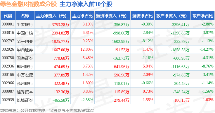 资金流向方面,绿色金融R(480052)指数成份股当日主力资金净流出合计4.96亿元,游资资金净流入合计1.4亿元,散户资金净流入合计3.55亿元。成份股资金流向详情见下表: