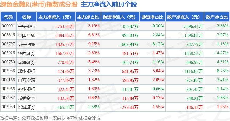 资金流向方面,绿色金融R(港币)(480053)指数成份股当日主力资金净流出合计4.96亿元,游资资金净流入合计1.4亿元,散户资金净流入合计3.55亿元。成份股资金流向详情见下表: