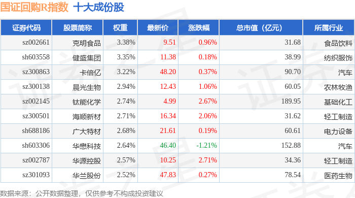 证券之星消息,11月27日,国证回购R(480063)指数报收于3856.83点,涨0.44%,成交107.42亿元,换手率1.32%。当日该指数成份股中,上涨的有29家,智动力以9.03%的涨幅领涨,下跌的有18家,京新药业以5.97%的跌幅领跌。