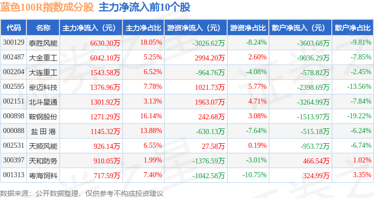 资金流向方面,蓝色100R(480068)指数成份股当日主力资金净流出合计7.61亿元,游资资金净流入合计2976.83万元,散户资金净流入合计7.32亿元。成份股资金流向详情见下表: