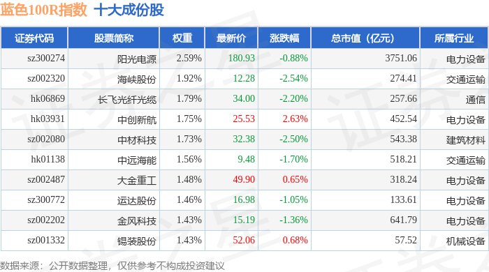 证券之星消息,11月27日,蓝色100R(480068)指数报收于4464.33点,跌0.28%,成交359.12亿元,换手率0.83%。当日该指数成份股中,上涨的有43家,泰胜风能以4.51%的涨幅领涨,下跌的有51家,中集集团以4.71%的跌幅领跌。