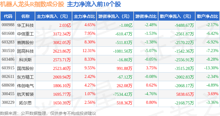资金流向方面,机器人龙头R(480071)指数成份股当日主力资金净流入合计1737.84万元,游资资金净流入合计8672.65万元,散户资金净流出合计1.04亿元。成份股资金流向详情见下表: