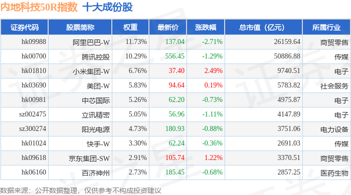 内地科技50R(483003)指数十大成份股详情如下: