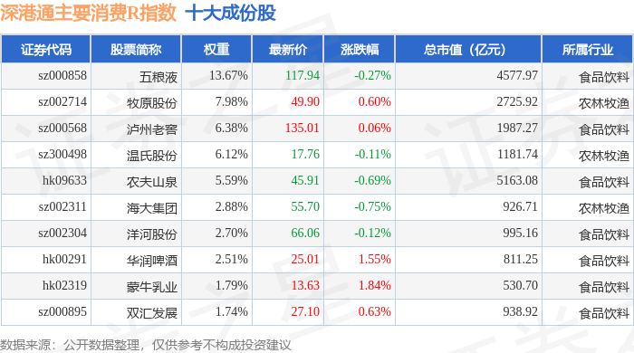 深港通主要消费R(483021)指数十大成份股详情如下: