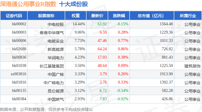 深港通公用事业R(483031)指数十大成份股详情如下: