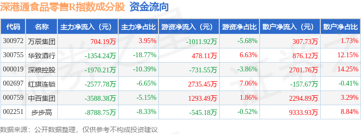 资金流向方面,深港通食品零售R(483037)指数成份股当日主力资金净流出合计1.76亿元,游资资金净流入合计2218.4万元,散户资金净流入合计1.54亿元。成份股资金流向详情见下表: