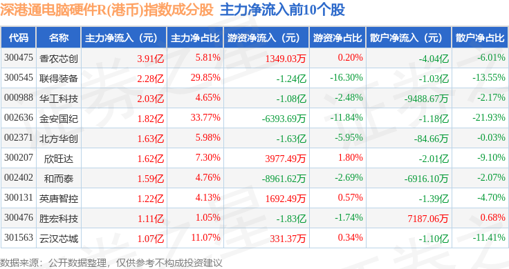 资金流向方面,深港通电脑硬件R(港币)(483044)指数成份股当日主力资金净流出合计22.23亿元,游资资金净流出合计1.01亿元,散户资金净流入合计23.24亿元。成份股资金流向详情见下表: