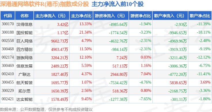 资金流向方面,深港通网络软件R(港币)(483048)指数成份股当日主力资金净流出合计31.61亿元,游资资金净流入合计3.87亿元,散户资金净流入合计27.73亿元。成份股资金流向详情见下表: