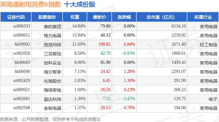 深港通耐用消费R(483049)指数十大成份股详情如下: