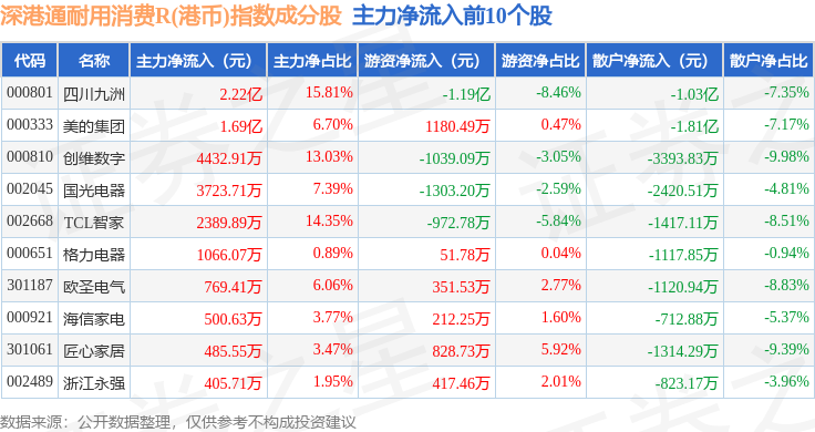 资金流向方面,深港通耐用消费R(港币)(483050)指数成份股当日主力资金净流出合计2.45亿元,游资资金净流出合计6241.25万元,散户资金净流入合计3.07亿元。成份股资金流向详情见下表: