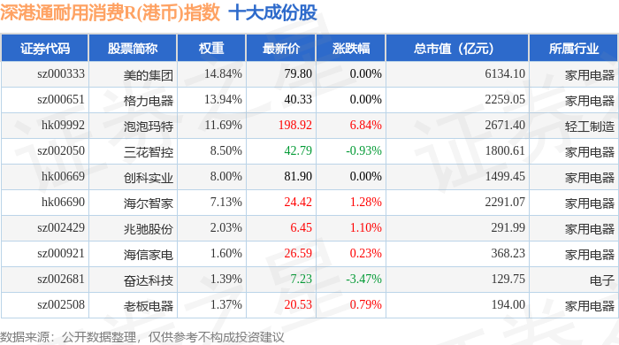 深港通耐用消费R(港币)(483050)指数十大成份股详情如下: