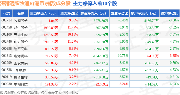 资金流向方面,深港通农牧渔R(港币)(483052)指数成份股当日主力资金净流出合计6991.57万元,游资资金净流出合计652.7万元,散户资金净流入合计7644.27万元。成份股资金流向详情见下表:
