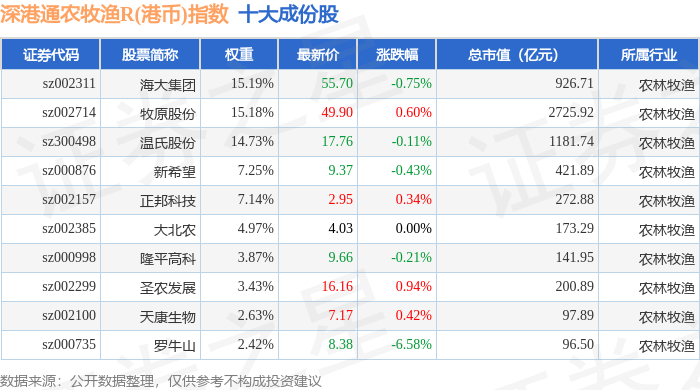 深港通农牧渔R(港币)(483052)指数十大成份股详情如下: