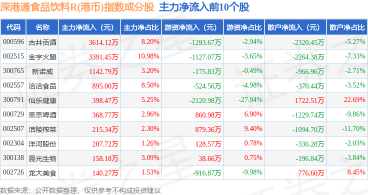 资金流向方面,深港通食品饮料R(港币)(483066)指数成份股当日主力资金净流出合计1.46亿元,游资资金净流入合计1.32亿元,散户资金净流入合计1381.47万元。成份股资金流向详情见下表: