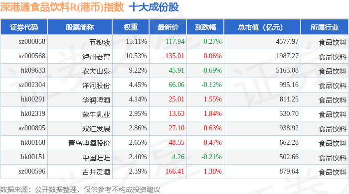 深港通食品饮料R(港币)(483066)指数十大成份股详情如下: