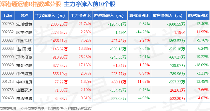 资金流向方面,深港通运输R(483077)指数成份股当日主力资金净流出合计1.78亿元,游资资金净流出合计8732.41万元,散户资金净流入合计2.65亿元。成份股资金流向详情见下表: