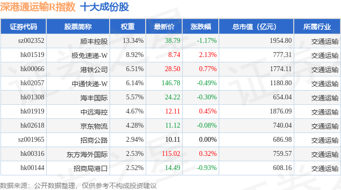 深港通运输R(483077)指数十大成份股详情如下: