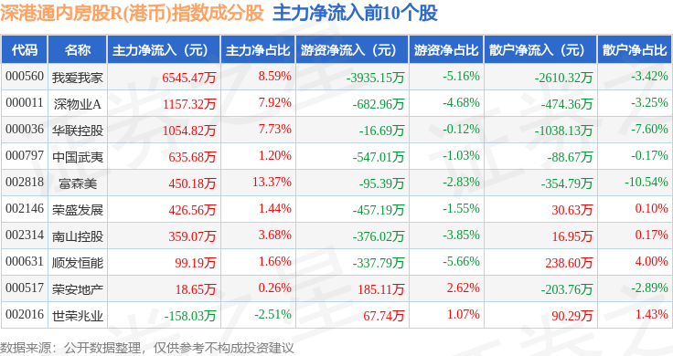 资金流向方面,深港通内房股R(港币)(483084)指数成份股当日主力资金净流出合计4.67亿元,游资资金净流入合计4745.0万元,散户资金净流入合计4.19亿元。成份股资金流向详情见下表: