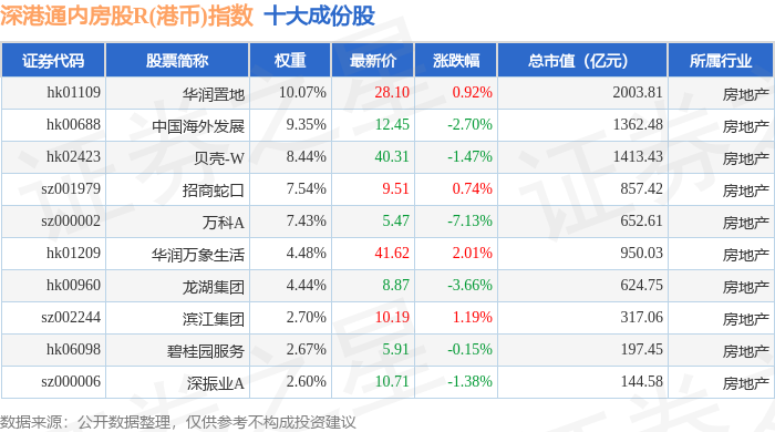 深港通内房股R(港币)(483084)指数十大成份股详情如下:
