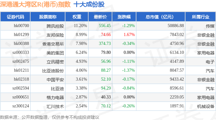 深港通大湾区R(港币)(483090)指数十大成份股详情如下: