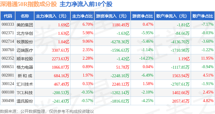资金流向方面,深港通50R(483091)指数成份股当日主力资金净流出合计30.6亿元,游资资金净流入合计16.9亿元,散户资金净流入合计13.7亿元。成份股资金流向详情见下表: