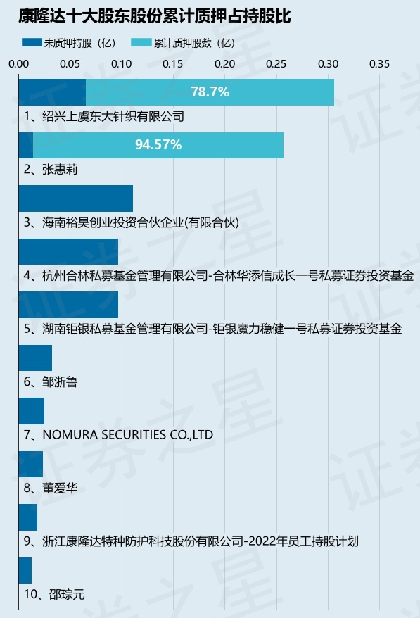 截止本公告日,股东绍兴上虞东大针织有限公司已累计质押股份2408.29万股,占其持股总数的78.7%,股东张惠莉已累计质押股份2430.0万股,占其持股总数的94.57%。本次质押后康隆达十大股东的累计质押股份占持股比例(占持股比例的计算以公司最新一期财务报表公布的十大股东的持股总数为基准)见下图: