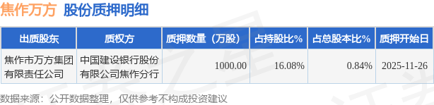 证券之星消息,焦作万方(000612)11月27日公开信息显示,股东焦作市万方集团有限责任公司向中国建设银行股份有限公司焦作分行合计质押1000.0万股,占总股本0.84%。质押详情见下表: