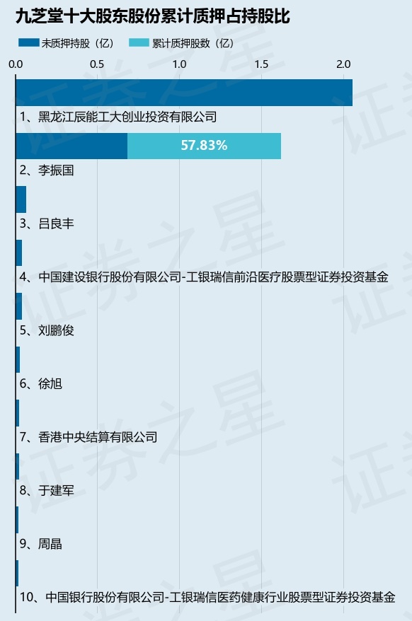 截止本公告日,股东李振国已累计质押股份9363.0万股,占其持股总数的57.83%。本次质押后九芝堂十大股东的累计质押股份占持股比例(占持股比例的计算以公司最新一期财务报表公布的十大股东的持股总数为基准)见下图: