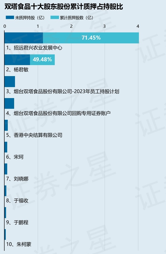 截止本公告日,股东招远君兴农业发展中心已累计质押股份2.88亿股,占其持股总数的71.45%,股东杨君敏已累计质押股份7480.0万股,占其持股总数的49.48%。本次质押后双塔食品十大股东的累计质押股份占持股比例(占持股比例的计算以公司最新一期财务报表公布的十大股东的持股总数为基准)见下图: