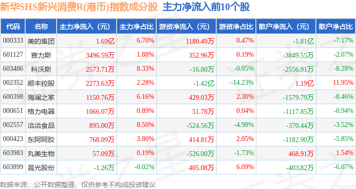 资金流向方面,新华SHS新兴消费R(港币)(489007)指数成份股当日主力资金净流出合计7.67亿元,游资资金净流入合计2.3亿元,散户资金净流入合计5.37亿元。成份股资金流向详情见下表: