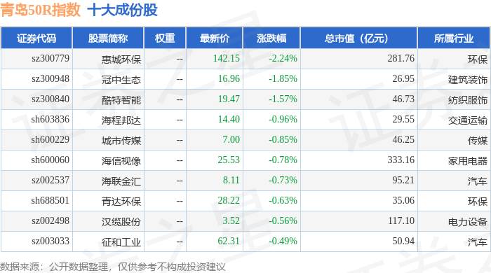 证券之星消息,11月27日,青岛50R(489011)指数报收于2663.17点,涨0.17%,成交65.83亿元,换手率1.18%。当日该指数成份股中,上涨的有21家,高测股份以4.93%的涨幅领涨,下跌的有15家,惠城环保以2.24%的跌幅领跌。