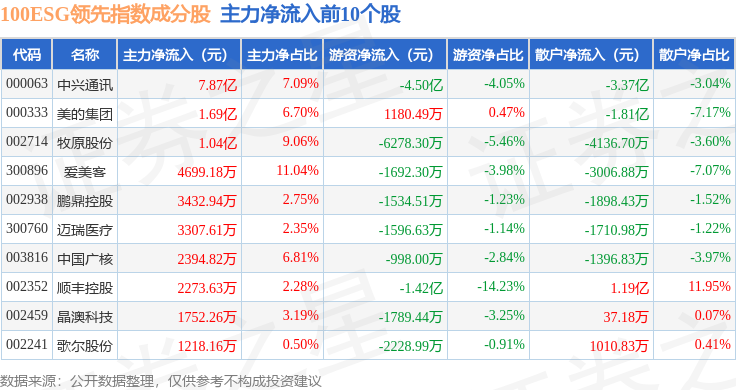 资金流向方面,100ESG领先(970030)指数成份股当日主力资金净流出合计39.91亿元,游资资金净流入合计18.22亿元,散户资金净流入合计21.69亿元。成份股资金流向详情见下表: