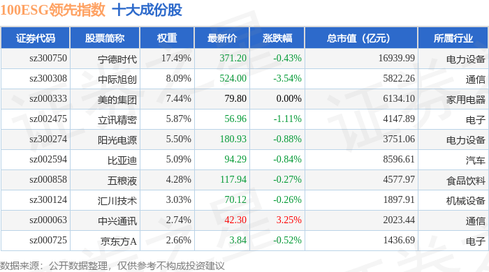 证券之星消息,11月27日,100ESG领先(970030)指数报收于6420.59点,跌0.67%,成交1189.23亿元,换手率1.06%。当日该指数成份股中,上涨的有19家,中兴通讯以3.25%的涨幅领涨,下跌的有29家,万科A以7.13%的跌幅领跌。