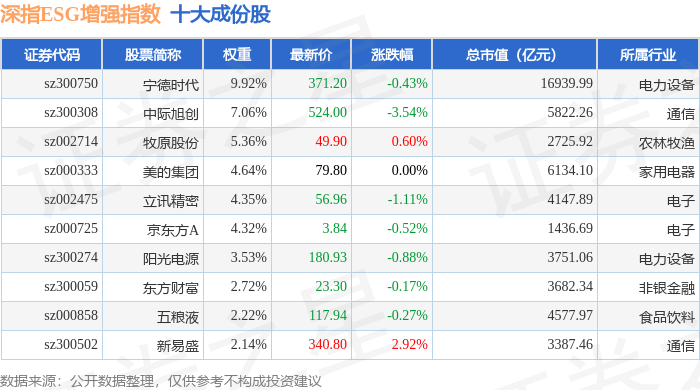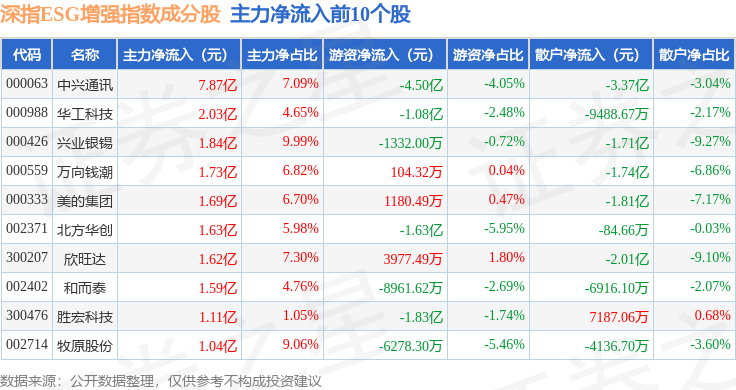 资金流向方面,深指ESG增强(970032)指数成份股当日主力资金净流出合计52.97亿元,游资资金净流入合计9.51亿元,散户资金净流入合计43.45亿元。成份股资金流向详情见下表:
