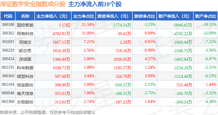资金流向方面,深证数字安全(970052)指数成份股当日主力资金净流出合计8.03亿元,游资资金净流入合计1.29亿元,散户资金净流入合计6.74亿元。成份股资金流向详情见下表: