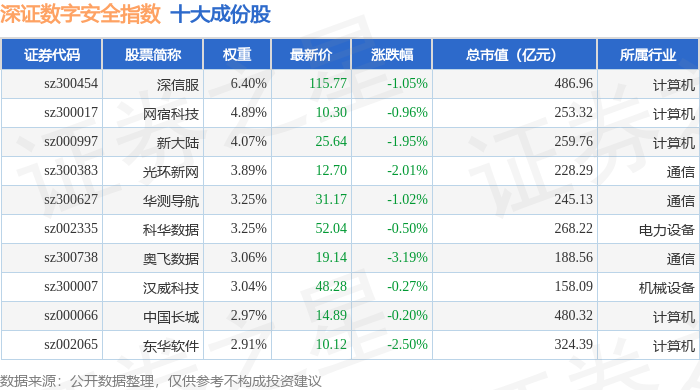 证券之星消息,11月27日,深证数字安全(970052)指数报收于3355.6点,跌1.1%,成交159.69亿元,换手率2.32%。当日该指数成份股中,上涨的有3家,国投智能以3.9%的涨幅领涨,下跌的有47家,奥飞数据以3.19%的跌幅领跌。