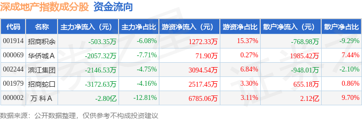 资金流向方面,深成地产(971001)指数成份股当日主力资金净流出合计3.58亿元,游资资金净流入合计1.37亿元,散户资金净流入合计2.21亿元。成份股资金流向详情见下表: