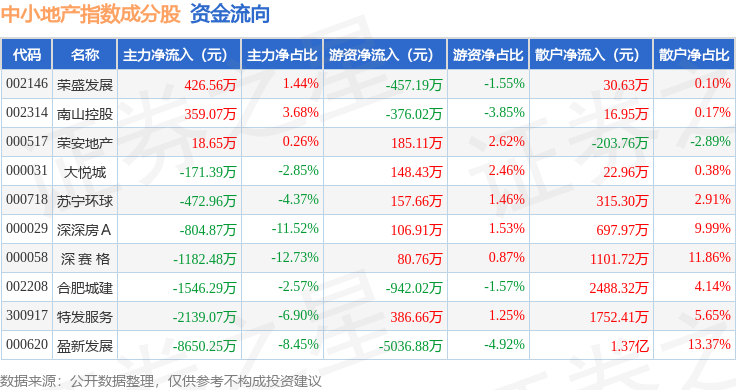 资金流向方面,中小地产(971002)指数成份股当日主力资金净流出合计1.42亿元,游资资金净流出合计5746.59万元,散户资金净流入合计1.99亿元。成份股资金流向详情见下表: