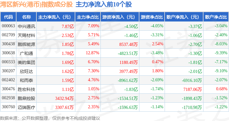 资金流向方面,湾区新兴(港币)(980008)指数成份股当日主力资金净流入合计2.83亿元,游资资金净流出合计6.28亿元,散户资金净流入合计3.45亿元。成份股资金流向详情见下表:
