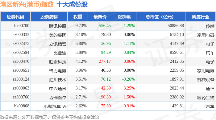 湾区新兴(港币)(980008)指数十大成份股详情如下:
