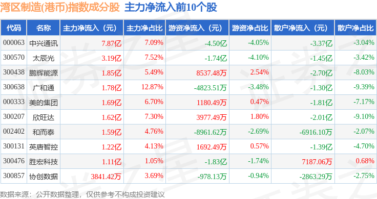 资金流向方面,湾区制造(港币)(980010)指数成份股当日主力资金净流入合计6.83亿元,游资资金净流出合计8.29亿元,散户资金净流入合计1.45亿元。成份股资金流向详情见下表: