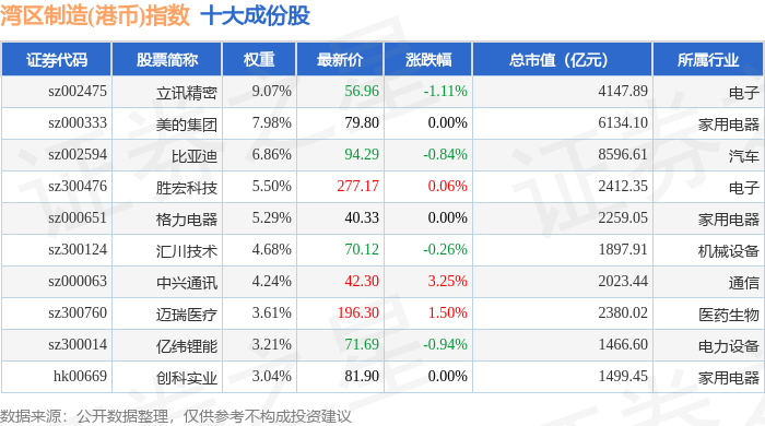 湾区制造(港币)(980010)指数十大成份股详情如下: