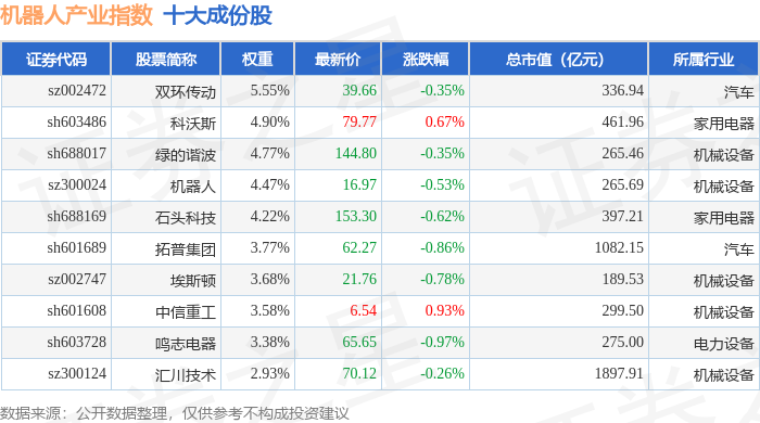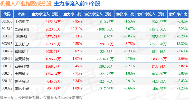 资金流向方面,机器人产业(980022)指数成份股当日主力资金净流出合计3.11亿元,游资资金净流出合计266.24万元,散户资金净流入合计3.07亿元。成份股资金流向详情见下表: