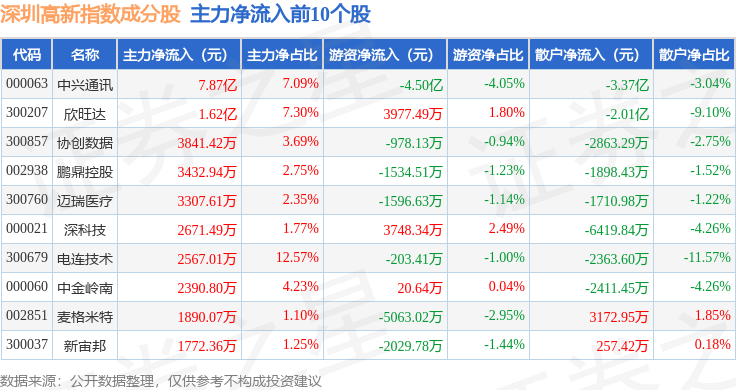 资金流向方面,深圳高新(980038)指数成份股当日主力资金净流出合计4.91亿元,游资资金净流出合计4.05亿元,散户资金净流入合计8.96亿元。成份股资金流向详情见下表: