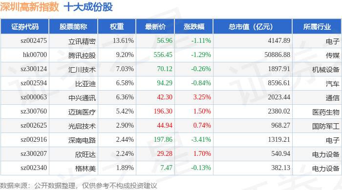 证券之星消息,11月27日,深圳高新(980038)指数报收于4806.5点,跌0.27%,成交694.77亿元,换手率1.8%。当日该指数成份股中,上涨的有18家,中兴通讯以3.25%的涨幅领涨,下跌的有30家,深南电路以3.41%的跌幅领跌。