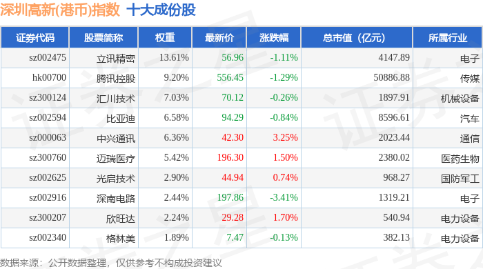 深圳高新(港币)(980039)指数十大成份股详情如下: