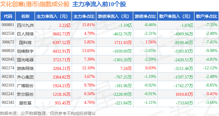 资金流向方面,文化创意(港币)(980047)指数成份股当日主力资金净流出合计28.77亿元,游资资金净流出合计2092.64万元,散户资金净流入合计28.98亿元。成份股资金流向详情见下表: